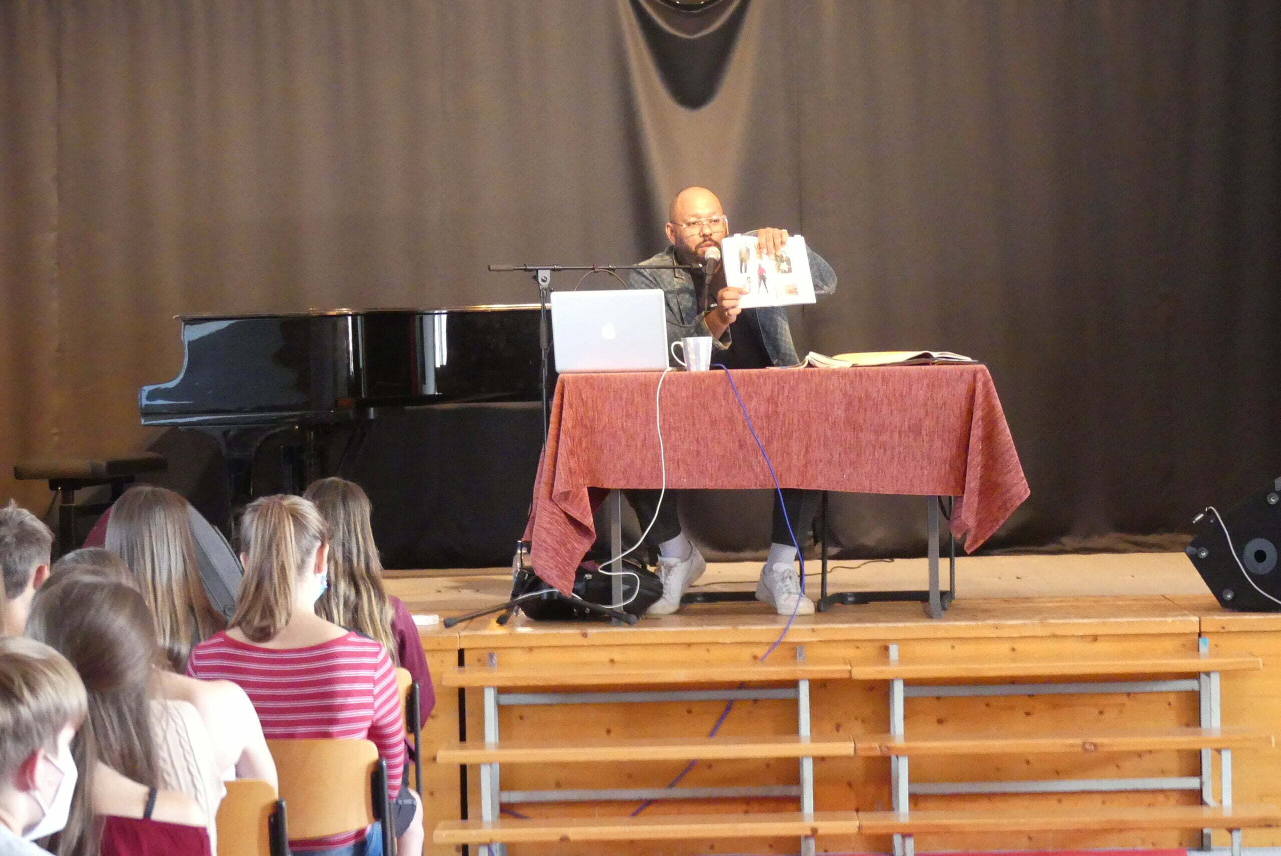 Am Dienstag, den 20.07.2021, besuchte im Rahmen unseres Zertifikats „Schule ohne Rassismus – Schule mit Courage“ der Autor/Moderator/Sänger David Mayonga aka Roger Rekless die Klassen der Jahrgangsstufen 8 bis 11, um den SchülerInnen aus seinem Spiegel-Bestseller „Ein N*** darf nicht neben mir sitzen“ vorzulesen. Bekannt ist der Künstler u.a. aus dem Bayerischen Rundfunk und der Sendung Puls. Er ist in der bayerischen Provinz groß geworden und spricht Dialekt. David Mayonga sieht sich in erster Linie als Bayer. Dennoch wird er aufgrund seiner Hautfarbe schon am ersten Tag im Kindergarten zurückgewiesen: „Nein, ein N**** darf nicht neben mir sitzen.“ Bis heute begleiten ihn rassistische Anfeindungen. Die Polizei durchsucht sein Auto, beim Einkaufen wird er mit „Was du wollen?“ begrüßt. In seinem Buch gibt David Mayonga einen Einblick, warum wir Menschen solch eine Angst vor dem Anderssein haben, warum wir diskriminieren und was wir tun können, um dem weniger Raum zu geben. Angereichert mit vielen persönlichen Erlebnissen appellierte David Mayonga in seiner Lesung gegen Angst und Vorverurteilung und für eine Gesellschaft, in der wir Menschen danach beurteilen, wer sie sind und nicht, wie sie aussehen. Dabei suchte er immer wieder den Austausch mit den SchülerInnen, sodass die Veranstaltung einem konstruktiven Gespräch zur Thematik „Rassismus“ glich. Aufgelockert wurde dieses durch musikalische Beiträge des Künstlers, u.a. im Freestyle. Nicht nur aufgrund dessen wird die Lesung in Erinnerung bleiben!